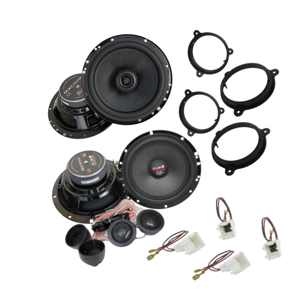 Pachet cu 2 difuzoare componente si 2 difuzoare coaxiale dedicate Dacia, cu inele si cablaj plug and play