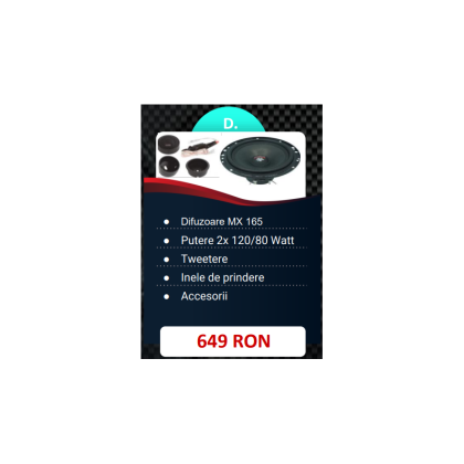 - Doua Difuzoare componente MX 165 EVO cu doua Tweetere HS 19 W EVO si cu Crossover FWK M (vezi produs)