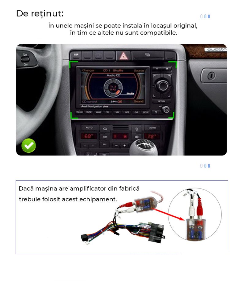 | 1. Este această unitate compatibilă cu modelul meu de mașină? | Kiturile de navigație sunt dedicate și se integrează perfect în bordul original şi păstrează comenzile de pe volan. Pentru compatibilitate și să nu apară probleme la montaj recomandăm să trimiteți o poză cu comanda sau înainte colegilor noștri și să spuneți dacă mașina are cameră de fabrică, amplificator de fabrică sau navigație de fabrică. |